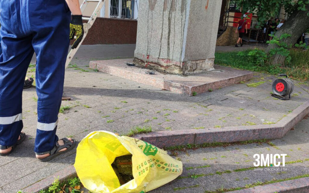 Комунальники підганяють кран до пам’ятника Миколі Ватутіну. Його встановили тут у 2013 році, а 21 вересня йому б виповнилося 10 років. Секретар міськради Андрій Карпов робить на його фоні селфі, а потім монумент чіпляють до маніпулятора і починають піднімати. Ватутін летить в історію.