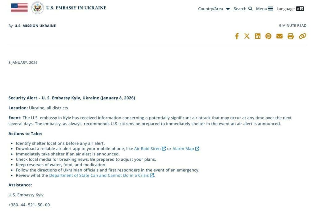 Також Посольство США в Києві підтвердило отримання даних про можливий масований удар з 8 січня.