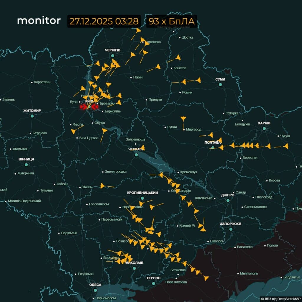 У ніч на 27 грудня розпочалася масована атака балістикою, крилатими ракетами та дронами. Вибухи лунали у Києві, на Сумщині, Полтавщині, Чернігівщині і не тільки. Повітряні Сили ЗСУ та OSINT-канали відстежують рух ворожих цілей.