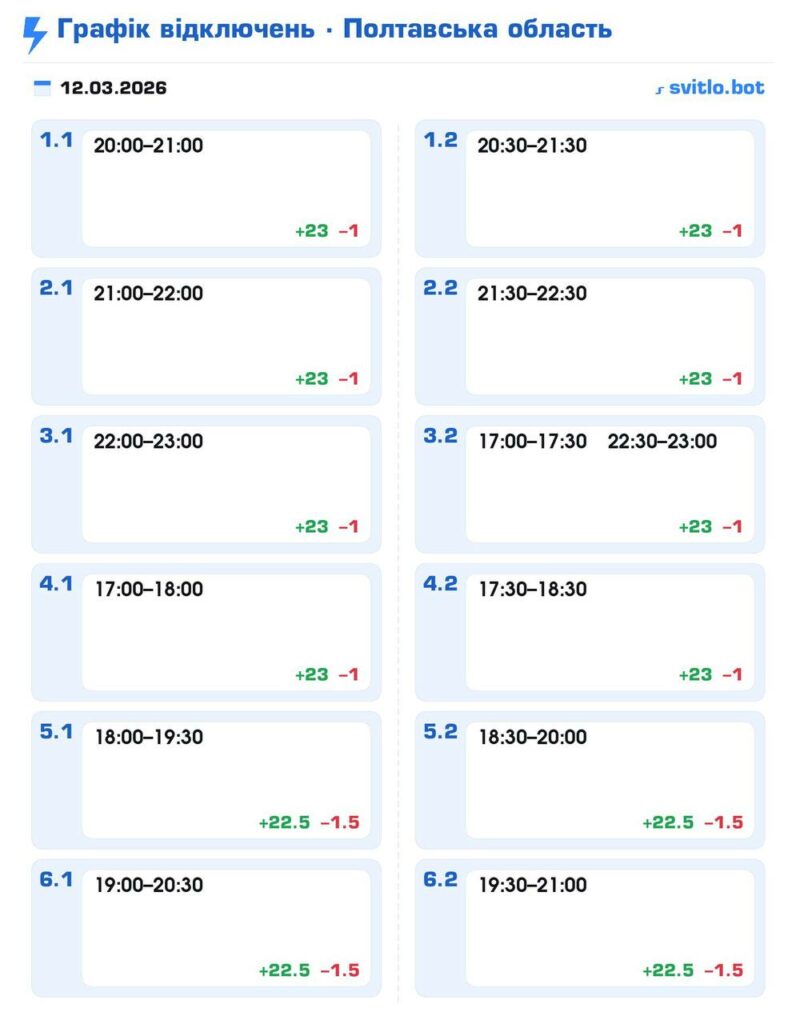 Графік відключень світла на 12 березня оприлюднили на сайті «Полтаваобленерго».