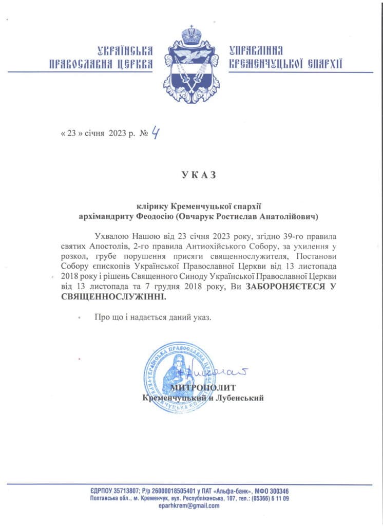 Про це йдеться в указі митрополита Кременчуцького й Лубенського Миколая, який оприлюднили на сайті Кременчуцької єпархії УПЦ МП 23 січня.