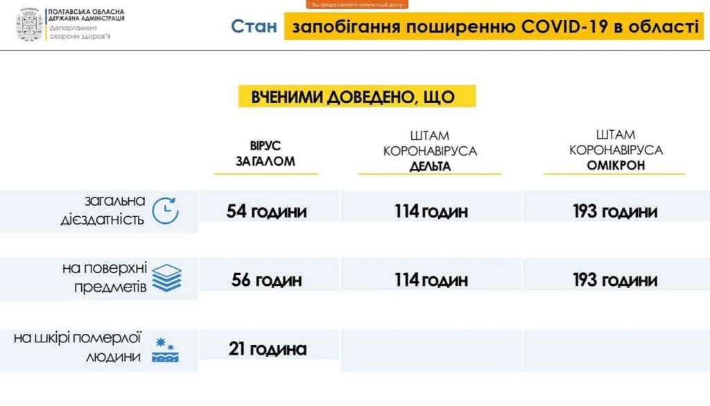 За даними ДОЗ, коронавірус «Омікрон» довше зберігає здатність заражати, ніж інші варіанти, зокрема на поверхні предметів.