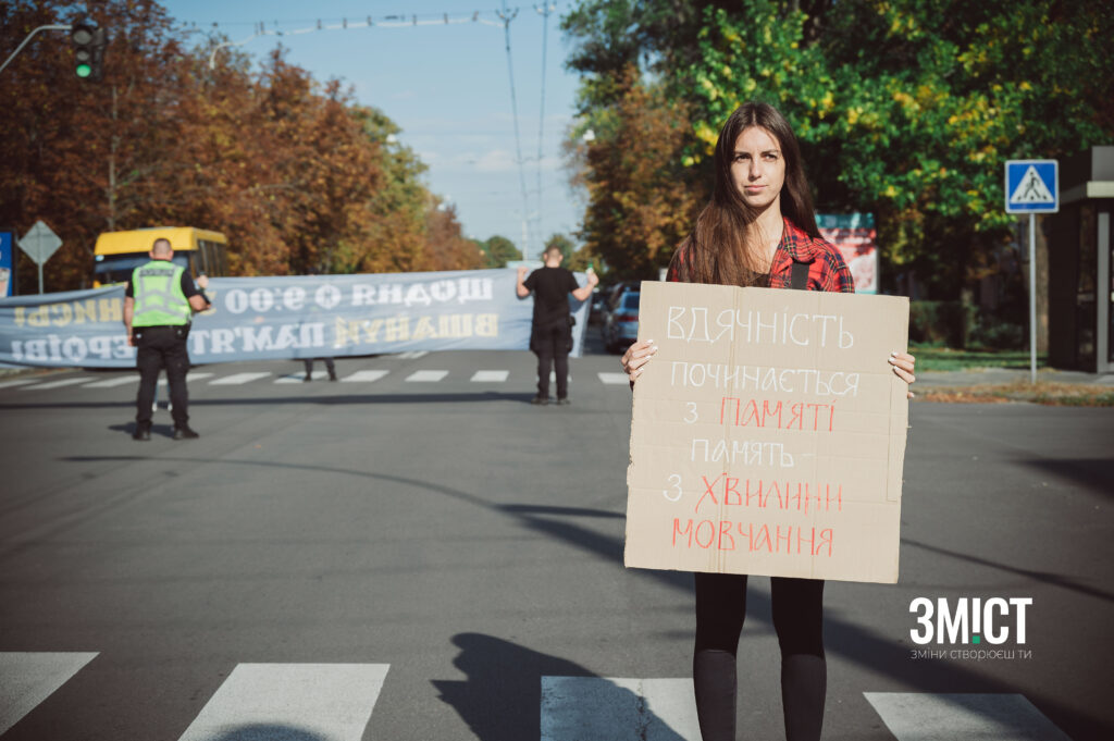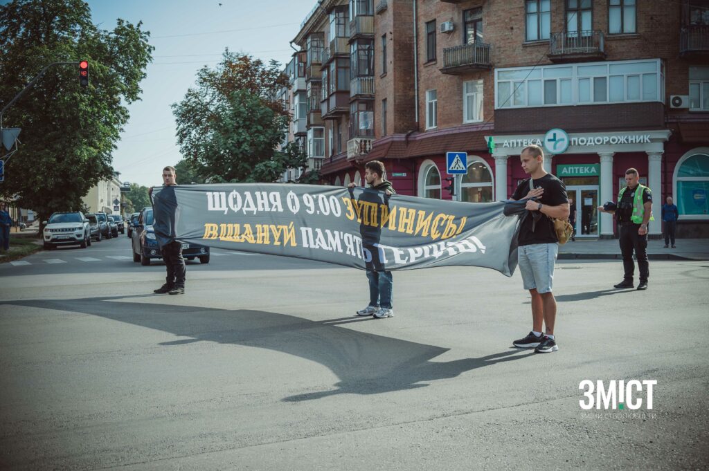 Поліція допомогла зупинити рух, а полтавці з картонними плакатами та символічним для акції стягом вийшли на дорогу. Вони закликали водіїв вийти з машин та хвилинною мовчання вшанувати загиблих.