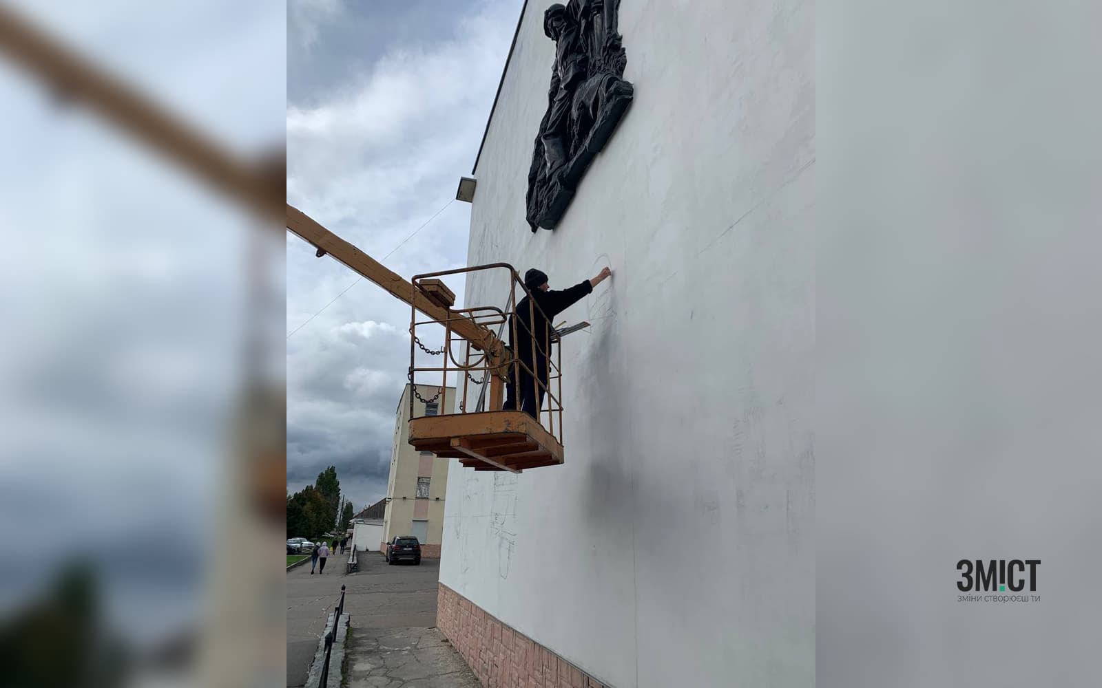 «Я думала розпочати ще влітку, але довгенько ремонт стіни тривав. Змінювали повністю штукатурку, бо та місцями відпадала. Спочатку барельєф думали зняти й окремо десь розмістити, але зрозумівши що при цьому його пошкодили, вирішили вписати його в мурал. Я попросила використати фото Павла Петрова, це фотограф із Київського ДСНС, а також наші фотографії. Особисто я хочу, щоб це була пам'ять про роботу рятувальників під час війни».