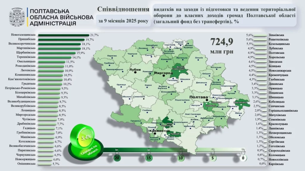 Найменше коштів надали Опішнянська, Новооржицька і Чорнухинська громади (5,7–6,5%). Крім того, з обласного бюджету на підтримку Сил оборони спрямовано 169 млн грн, а з районних бюджетів – 4 млн грн.