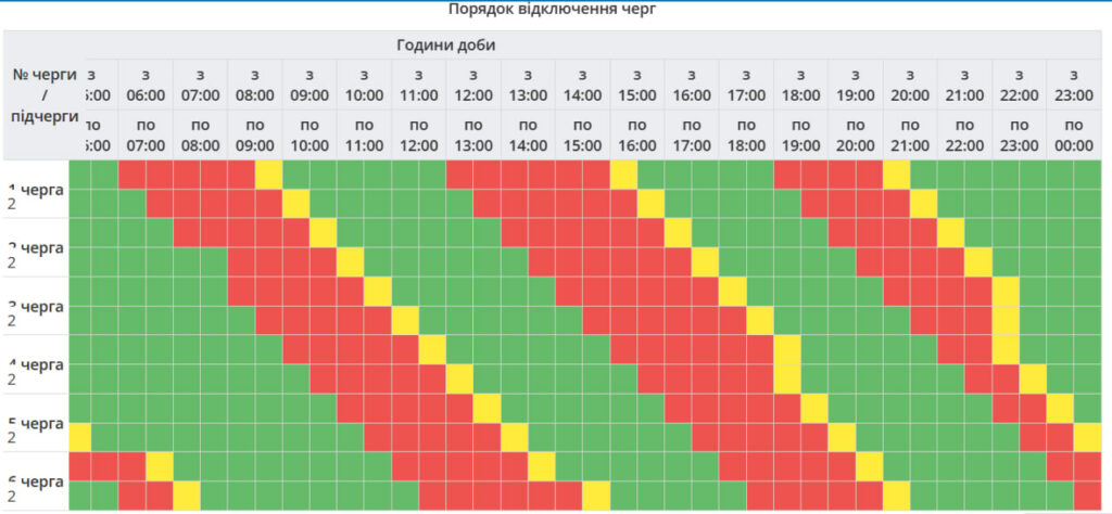 Знеструмлення охоплюють шість черг споживачів. Вони триватимуть від півгодини до 3 год для кожної з черг у різний час доби:
