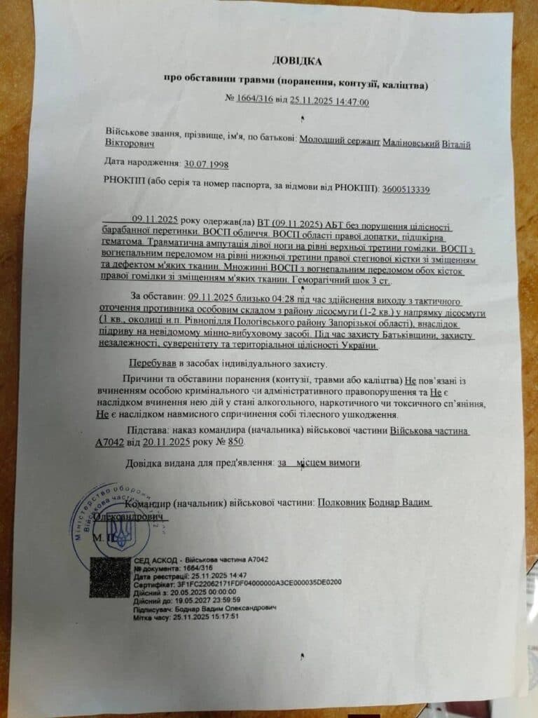 Відомо, що боєць разом з побратимами, тривалий час утримували позицію на околицях Рівнопілля Пологівського району на Запоріжжі, перебуваючи у глибокому оточені ворогом, проте їм вдалося вирватися. Саме Віталій Маліновський 9 листопада 2025 року виводив групу та пройшовши більше 3 км підірвався на міні одразу втративши одну кінцівку, а іншу частину ноги воїну ампутували потім.