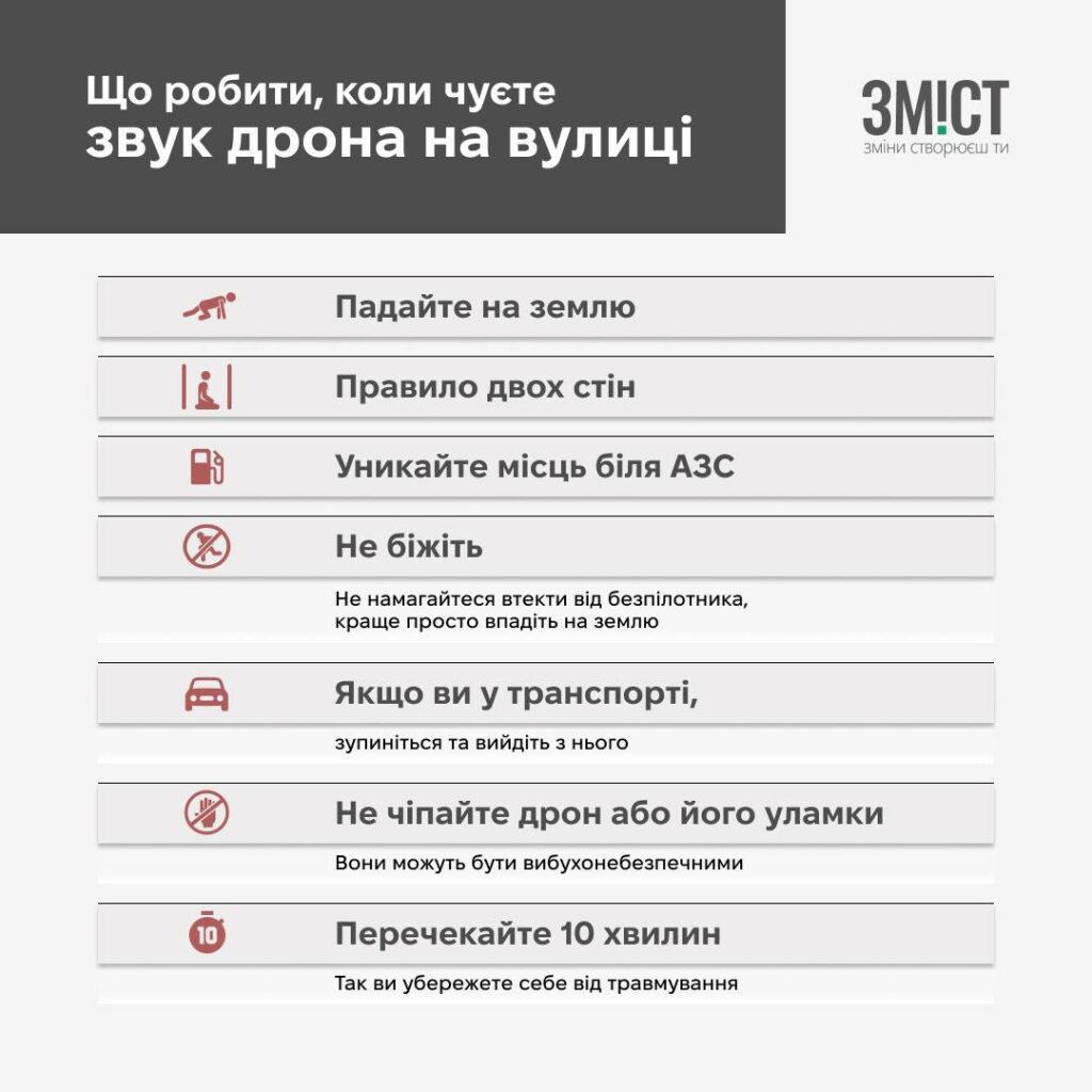 - Не біжіть. Не намагайтеся втекти від безпілотника, краще просто впадіть на землю або укрийтеся за двома стінами, якщо такі є поруч. Є шанс, що ви бігтимете в напрямку епіцентра вибуху.