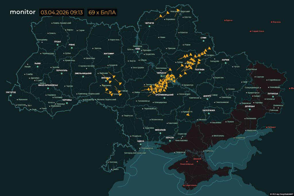 OSINT-канали повідомляють, що до 300 БПЛА збільшується кількість запущених цілей. Група з приблизно 40 дронів БпЛА летить курсом на Черкащину через Полтавщину. Ще орієнтовно 15 дронів рухаються від Охтирки до Миргорода.