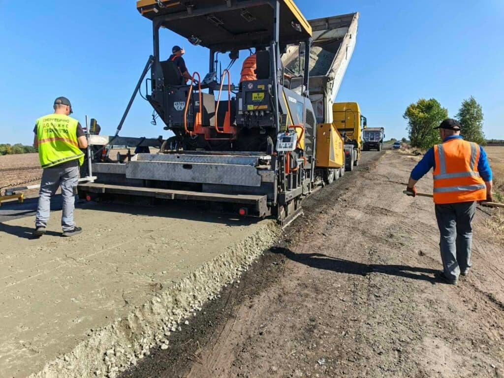 На ділянці зняли пошкоджені шари дорожнього покриття, укріпили основу цементом і вклали нижній шар крупнозернистого асфальтобетону. Будівельники працюють одразу на обох проїздах, щоб прискорити темпи.