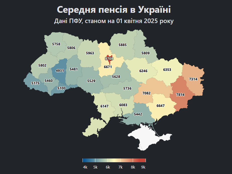 Загалом найбільші пенсії в Україні виплачують на Київщині, а найнижчі: на Тернопільщині – 4 тис. 931 грн та в Чернівецькій області – 5 тис. 100 грн.
