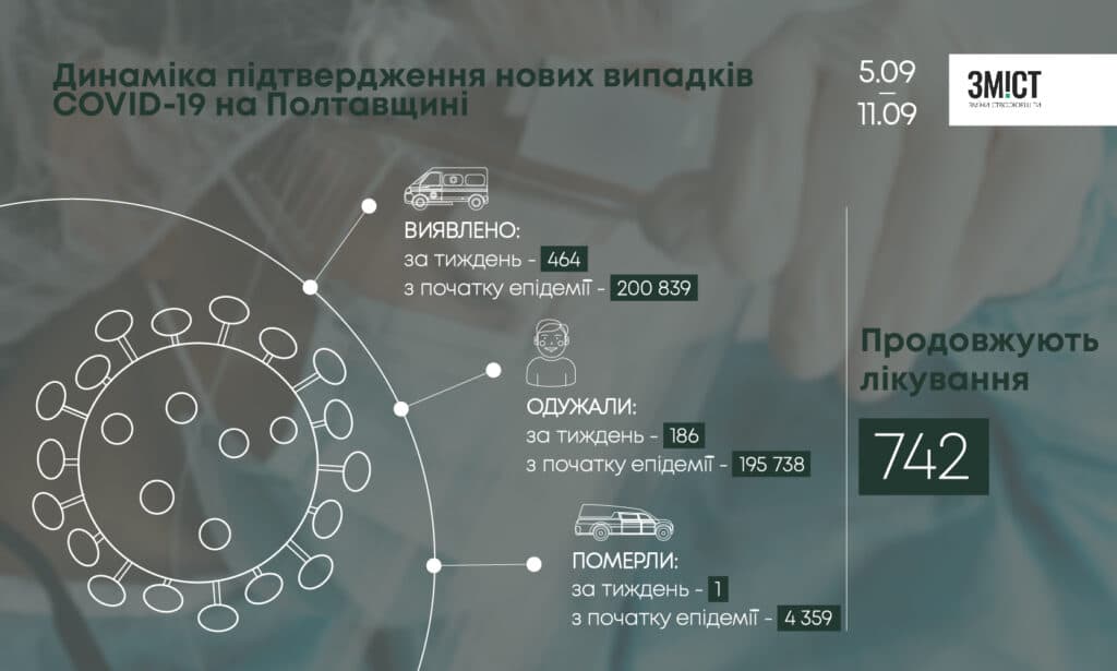 За період з 5 до 11 вересня на Полтавщині COVID-19 діагностували у 464 людей. За тиждень одужали 186 хворих.