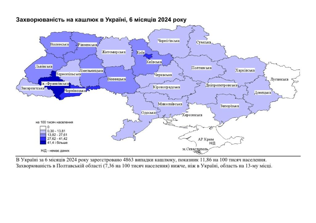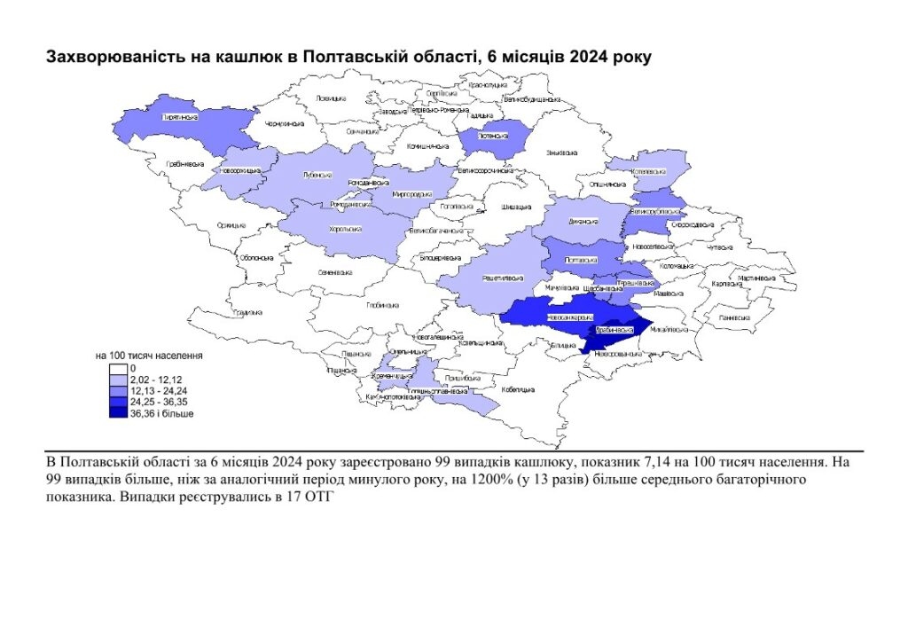 Захворюваність на кашлюк істотно зросла в порівнянні з першим півріччям 2023 року – у 13 разів за середній багаторічний показник. Випадки хвороби реєстрували у 17 громадах Полтавщини, проте Драбинівська громада і Новосанжарська громада мають найвищі рівні захворюваності.