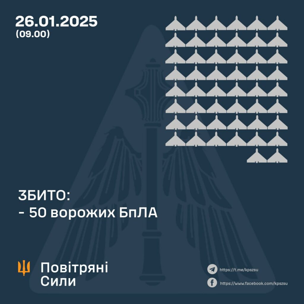 Станом на 09:00 підтвердили збиття 50-ти безпілотників у Київській, Одеській, Харківській, Полтавській, Сумській, Донецькій, Дніпропетровській та Хмельницькій областях.