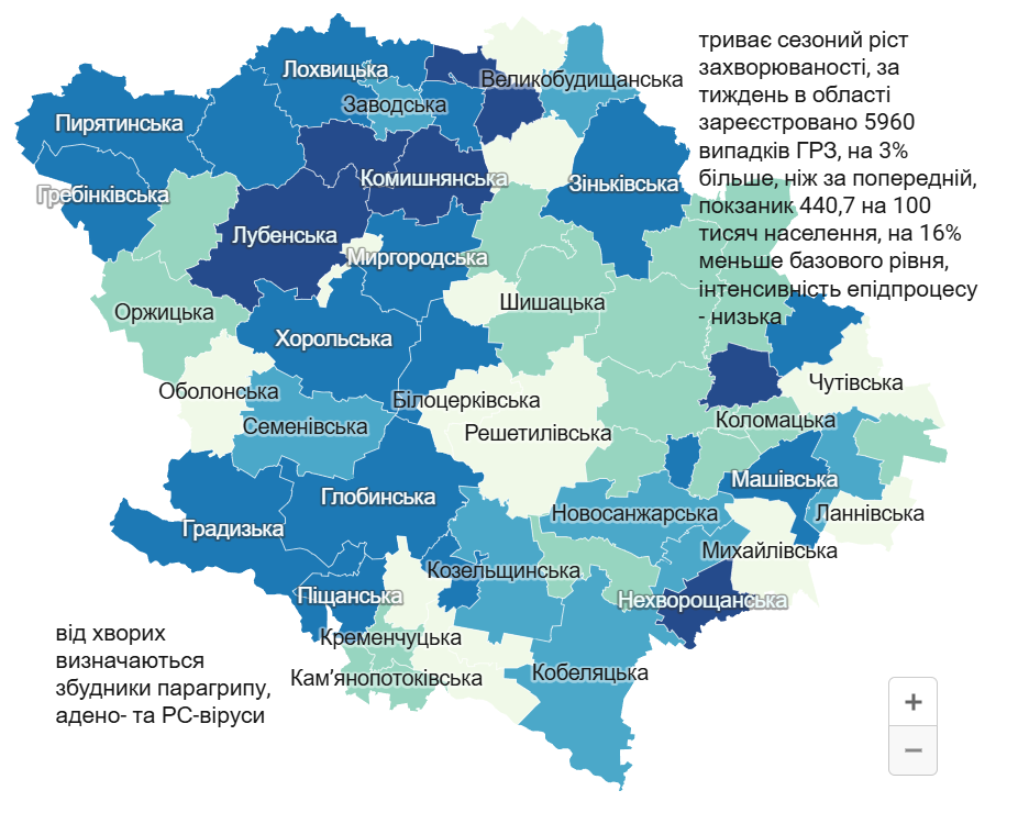 Найвищі показники захворюваності на ГРВІ фіксують у Нехворощанській громаді – дуже високий рівень, а також високий у Новоселівській, Сергіївській, Сенчанський Лубенський, Гадяцькій громадах.