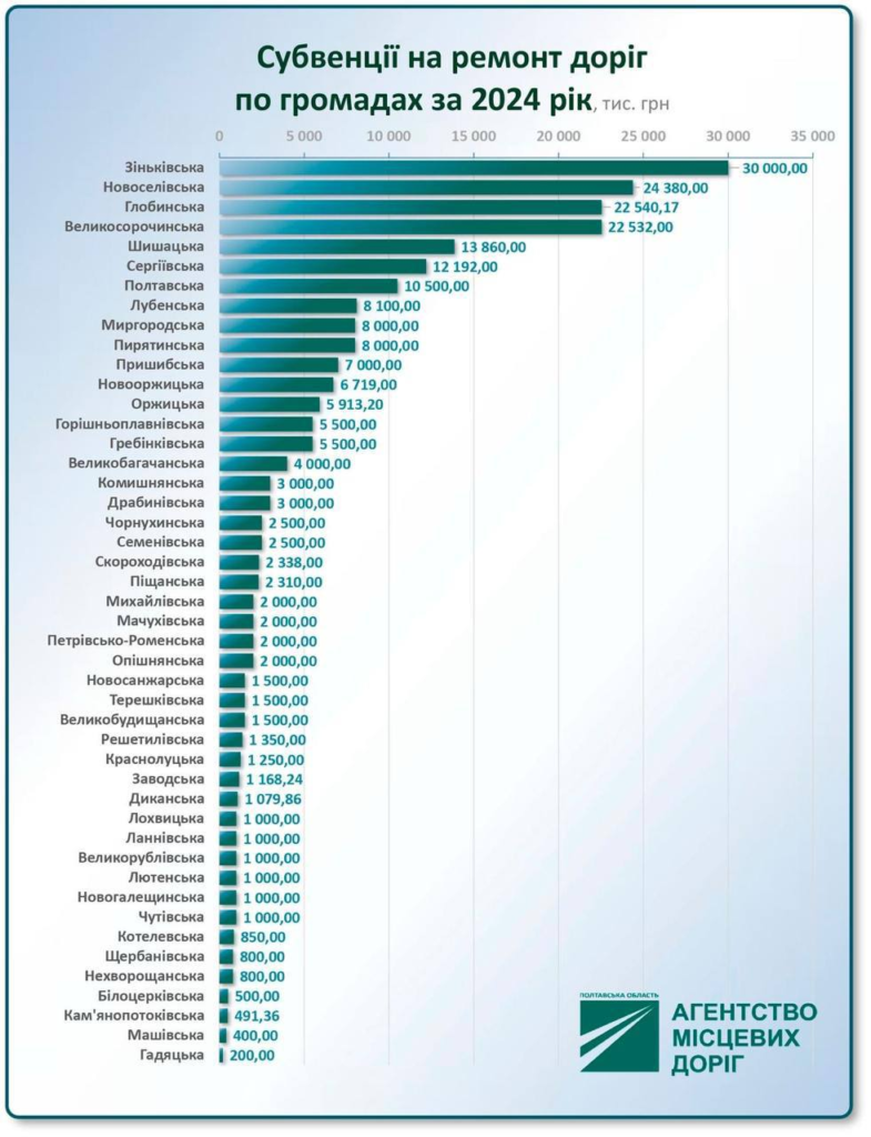 Роботи виконували у 46 громадах, які спрямували загалом на ремонти й утримання 263,8 млн грн на умовах співфінансування. Серед лідерів – Зіньківська, Новоселівська, Глобинська та Великосорочинська громади, які залучили найбільший обсяг коштів.
