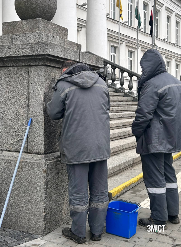 Плитку довкола міської ради розписали червоною фарбою. Речник Полтавського районного управління поліції Василь Зуб розповів ЗМІСТу, що наразі зловмисників розшукують: