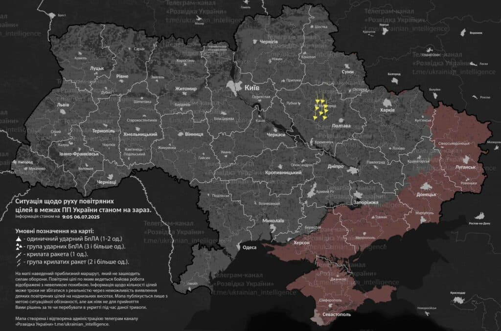 Станом на 09:05 група ударних БпЛА перебувала у центрі Полтавщини, рахуючись у південно-західному напрямку. Біля Кременчука фіксують безпілотники, як і в напрямку Козельщини, загалом сім таким курсом.