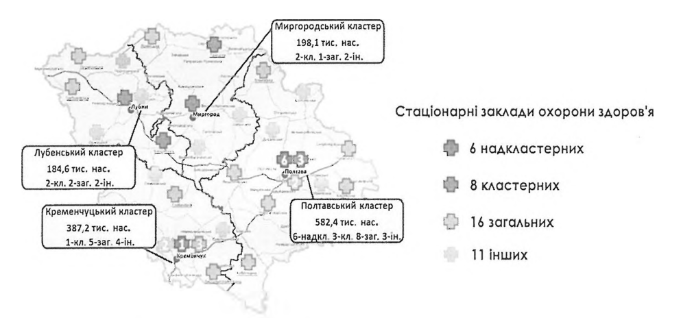 До Полтавського госпітального округу увійшли 4 кластери – Полтавський, Кременчуцький, Лубенський та Миргородський. Мережа сформована так, щоб відповідати потребам населення в кожному районі. Маршрути доставки пацієнтів розроблені, аби хворі потрапляли до лікарні, яка відповідає їхньому стану й має необхідні ресурси.