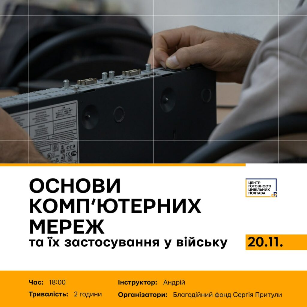 - 20 листопада о 18:00 відбудеться практичний тренінг «Основи комп'ютерних мереж та їх застосування у війську». Тут можна навчитися загальним поняттям про комп’ютерні мережі та як їх використовувати у війську, яке існує обладнання і протоколи, а також наскільки важливі сучасні цифрові технологій для взаємодії та керування. Реєстрація за посиланням.