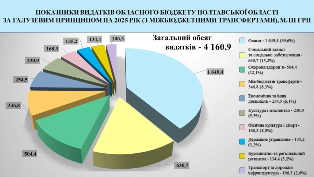 Видатки з бюджету Полтавщини очікують на рівні 4 млрд 160,9 млн грн. Як розподілили гроші на ключові галузі, зокрема за відсотками: