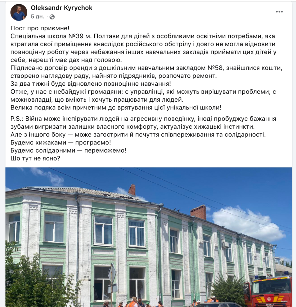 17 вересня Департамент освіти Полтавської міської ради оголосив тендер на пошук підрядної компанії для ремонту приміщень дошкільного закладу №58 «Калинка». Спеціалізована школа №39 планує, що у цих приміщеннях тепер навчатимуться учні з особливими освітніми потребами. Орієнтовна вартість робіт становить 9,3 млн грн. Ще раніше оголосили тендер на ремонт покрівлі з очікуваною вартістю 470 тис. грн.