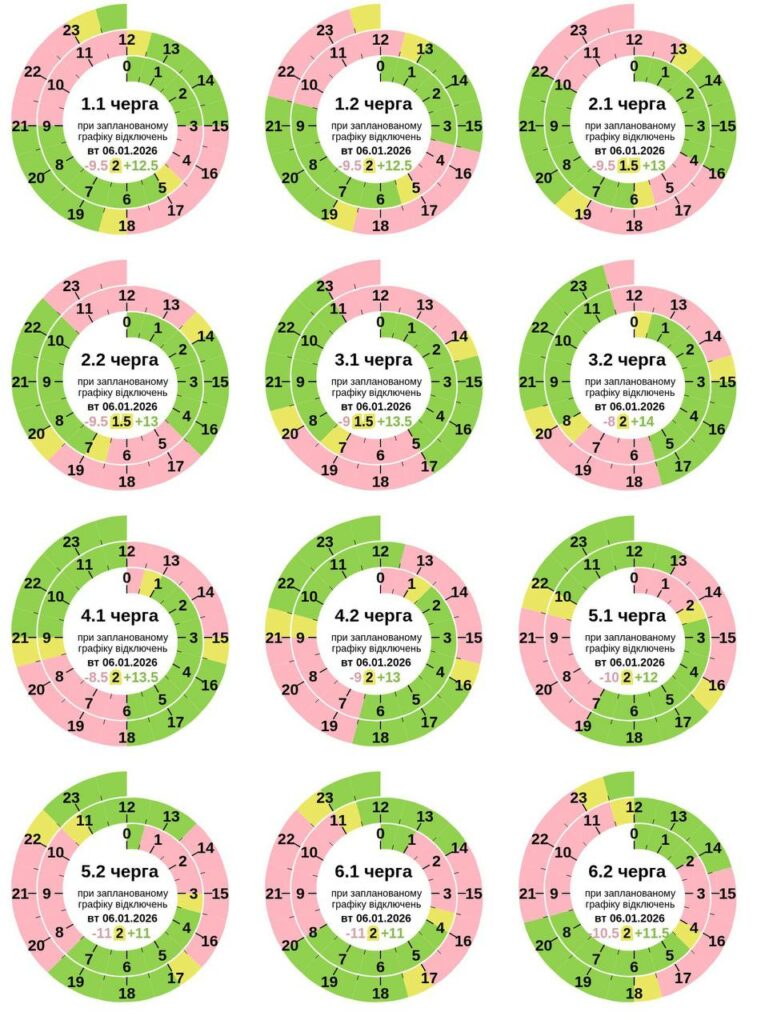 Знеструмлення охоплюють шість черг споживачів. Вони триватимуть від 2 год до 3 год для кожної з черг у різний час доби: