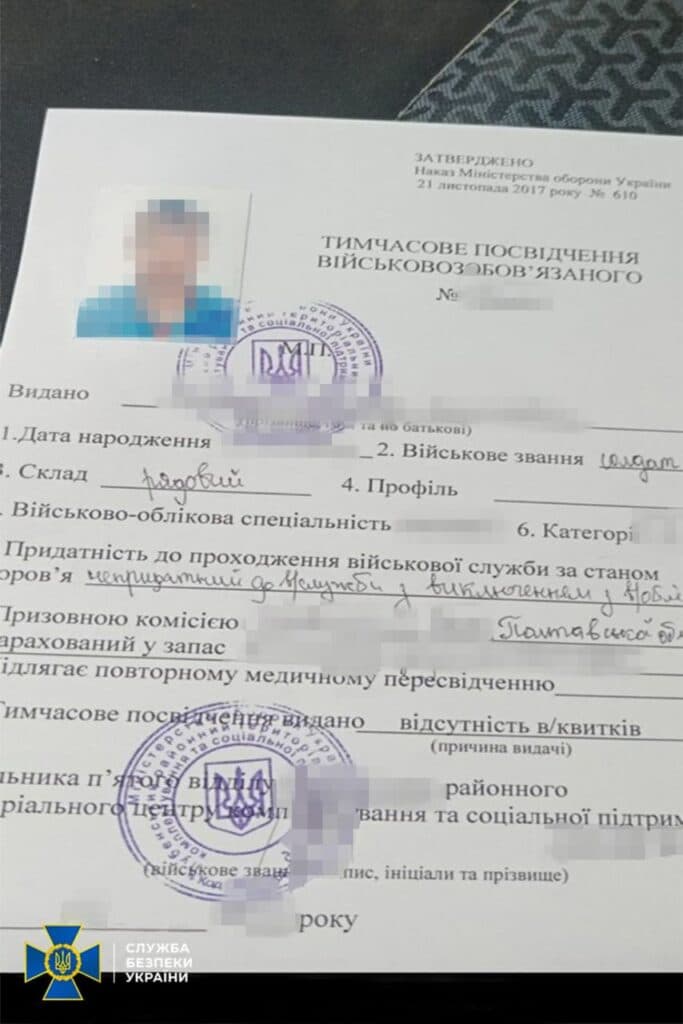 Зокрема, спочатку клієнту «допомагали» отримати заключення військово-лікарської комісії про непридатність до військової служби за фіктивним діагнозом, а потім і зовсім знімали з військового обліку.
