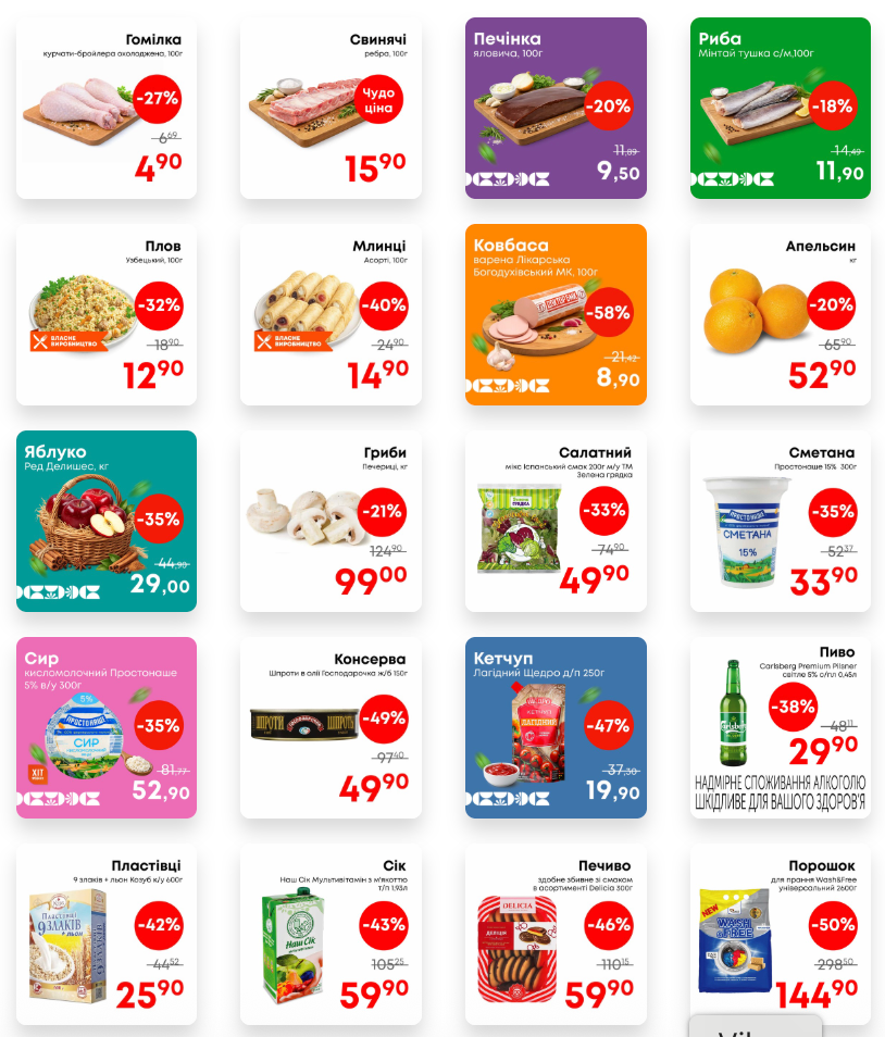 - Куряча гомілка: знижка -27% (ціна 4,90 грн за 100 г);