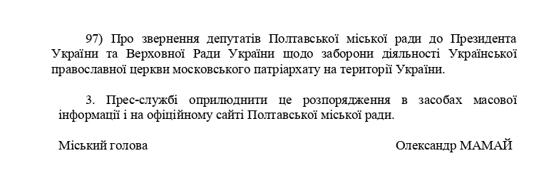 На засіданні сесії 9 вересня депутати мали розглянути питання про звернення Полтавської міської ради до Президента України та Верховної Ради України щодо заборони діяльності Української православної церкви московського патріархату на території України.
