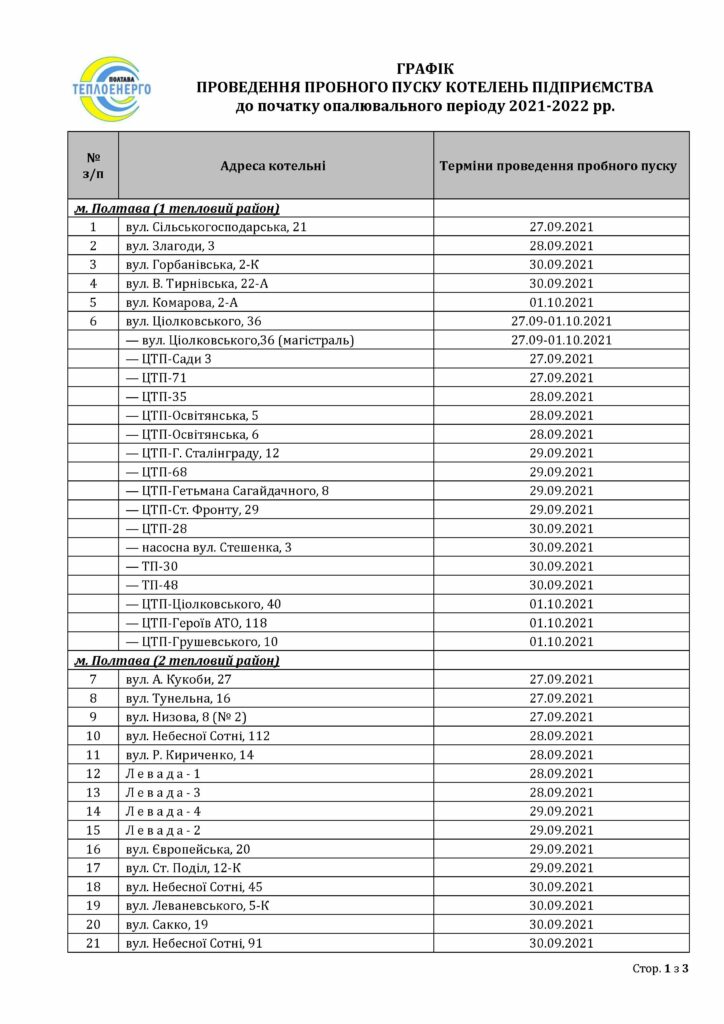 Відтак, пробні пуски котелень пройдуть за таким графіком: