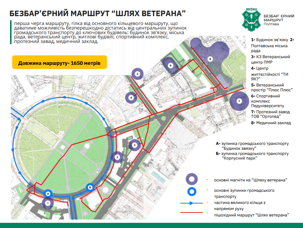 «Безбар'єрний маршрут ветерана» планують створити навколо кільцевої дороги громадського транспорту в Полтаві. Очікується, що цей маршрут об’єднає ключові адміністративні, соціальні, освітні, медичні та комерційні об'єкти з найгустонаселенішими мікрорайонами міста. Довжина маршруту становитиме близько 24,9 км.