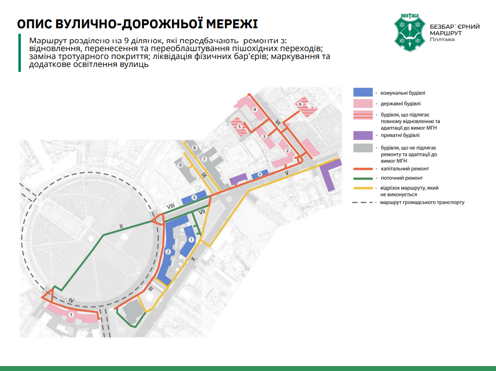 Спершу планують створити облаштувати шлях від центральних зупинок. Гілка від основного кільцевого маршруту дасть можливість людям з інвалідністю дістатися до ключових будинків міста, зокрема: