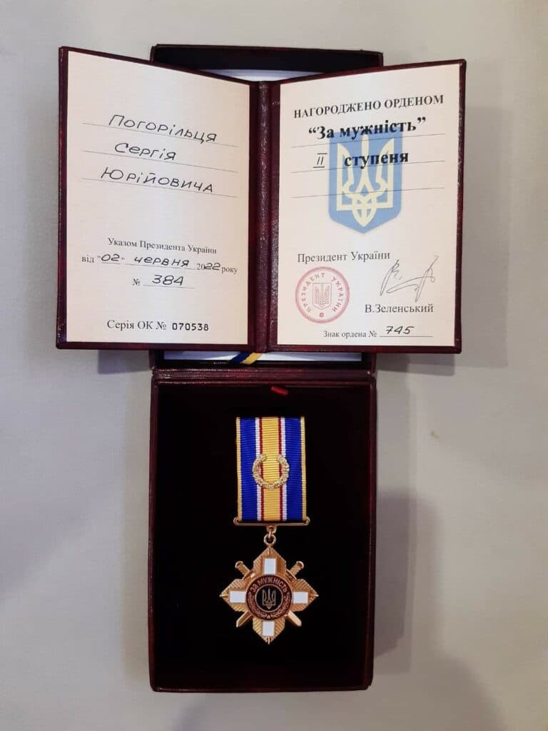 Указом Президента України №384 від 2 червня Сергія Погорільця нагородили орденом «За мужність» ІІ ступеня. Воїн є студентом магістратури в Кременчуцькому університеті, де здобуває економічну освіту.