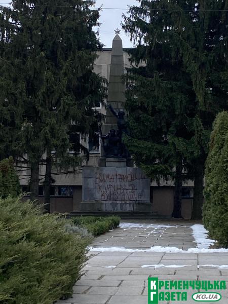 Пам’ятник знаходиться на площі Перемоги у Кременчуці. Днями на ньому з’явився напис «Зима прийшла, комуна в дупу пішла».