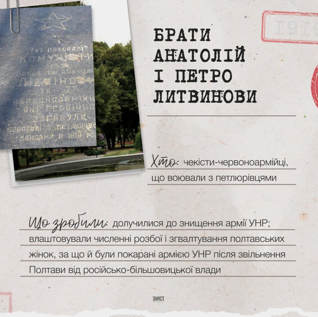 Після встановлення радянської влади у Полтаві у Петровському парку поховали 27 червоноармійців та вбитих на початку 1919 року чекістів братів Литвинових – Анатолія та Петра, які народилися на Чутівщині. На могильній плиті видніється надпис, що комуністи загинули у боротьбі з «петлюрівськими бандами».