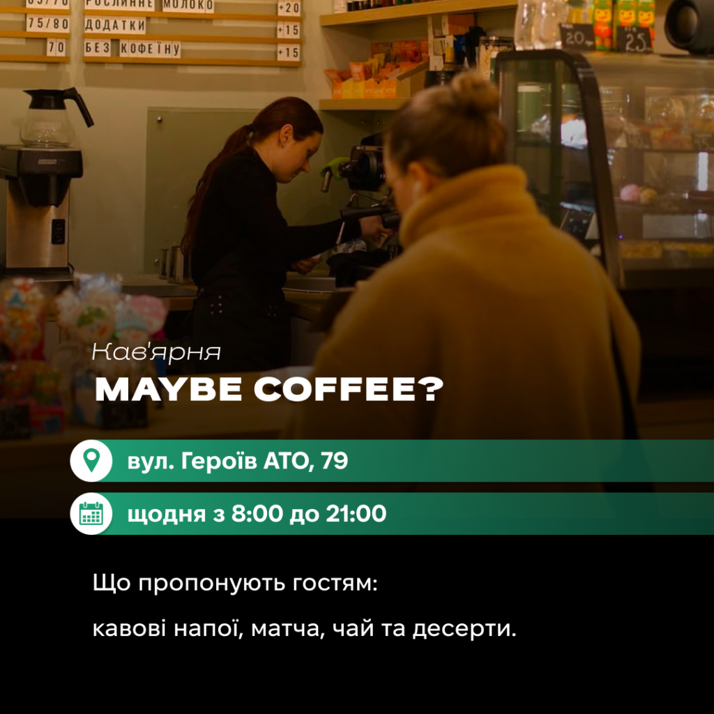 Кав’ярня Maybe Coffee? пропонує гостям інстаграмну атмосферу. Відвідувачі можуть скуштувати авторські напої та різні види матчі. Також у кав’ярні виготовляють десерти й даніші.