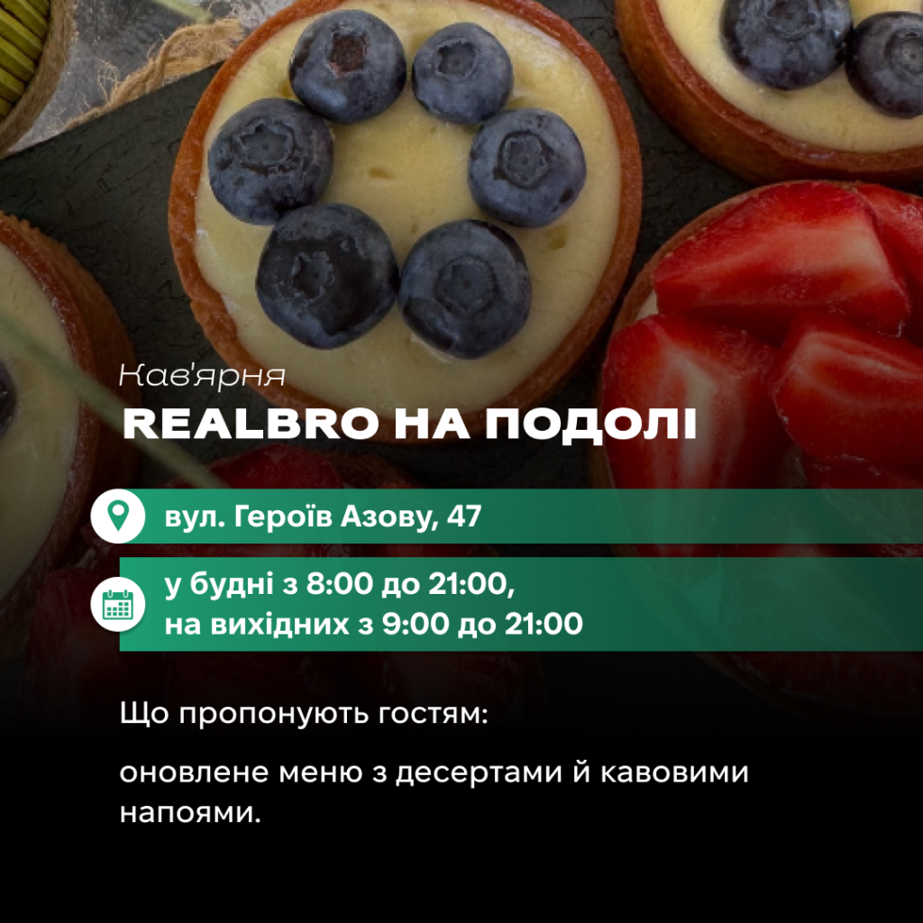 Також свій другий заклад відкрила кав’ярня RealBRO на Подолі. Для гостей доступні фірмові десерти та кавові напої. Команда створила простір для тварин та оновила меню. За відмітку в сториз гості отримують знижку.