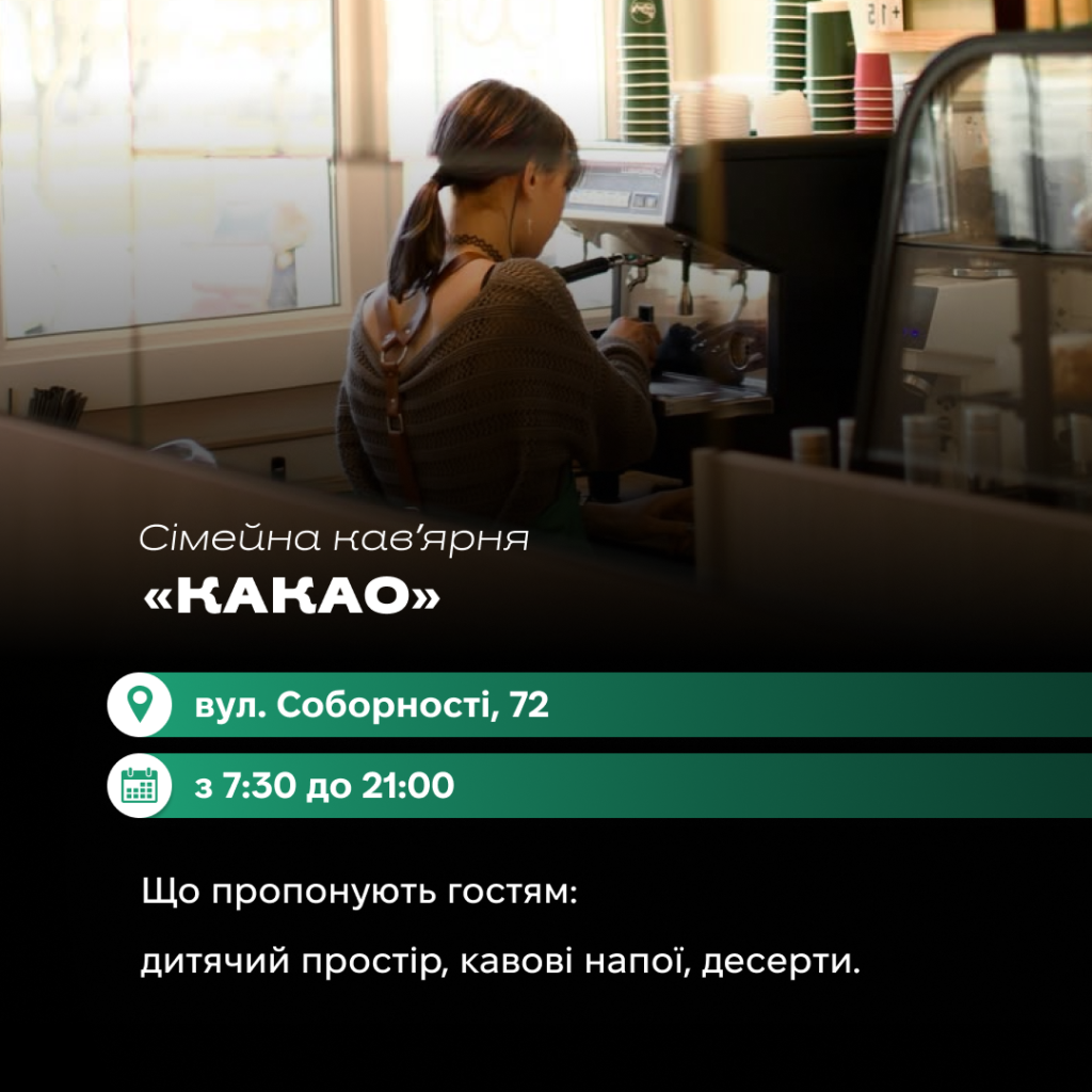 Сімейна кавʼярня «Какао» відкрила друге приміщення поблизу Каштанової алеї. У закладі облаштували простір для гостей із дітьми. Окрім десертів на замовлення, з 13:00 до 15:00 відвідувачам дарують печиво з передбаченням до кожної чашки.