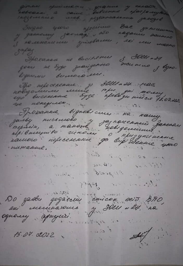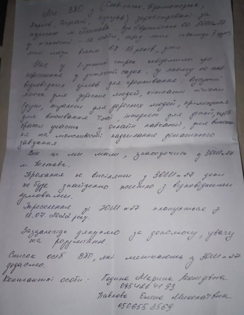 У дитсадку нині живуть 90 переселенців й попри це, туди планують переселити людей ще з 2 шкіл. Олена Павлова разом з іншими переселенцями написали звернення до міськради та до Віце-прем’єр-міністерки Ірини Верещук з проханням не виселяти їх зі школи № 27, поки для них не знайдуть нове місце.