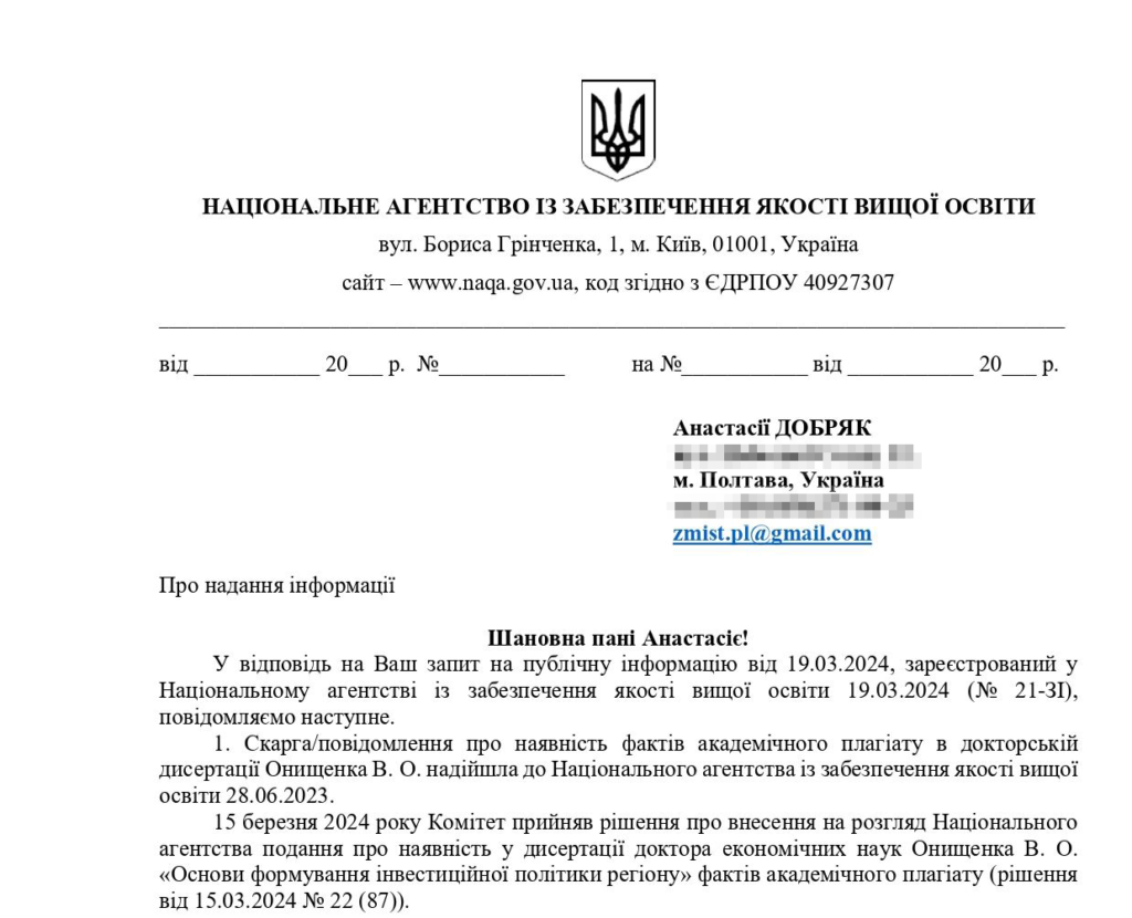 Комітет виніс на розгляд НАЗЯВО подання про наявність у дисертації Онищенка фактів академічного плагіату. Тепер його розглядатимуть на засідання агентства.