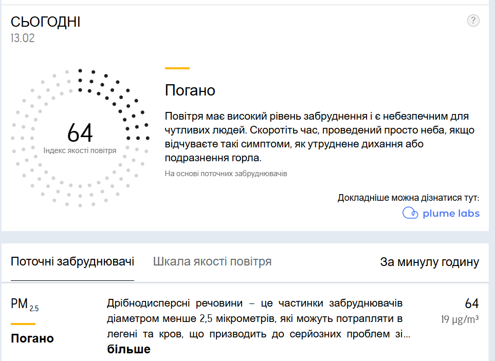За даними ресурсу AccuWeather, нині в Полтаві фіксують високий рівень забруднення.
