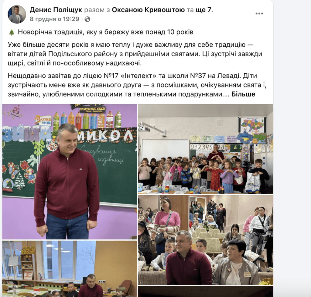 ЗМІСТ писав, що депутати і посадовці періодично бувають у школах, де можуть агітувати за себе як політиків. Приміром, депутат Полтавської міської ради та керівник КП «Полтава-сервіс» Денис Поліщук на власній сторінці у фейсбуці розповідає, як агітує в школах. У ліцеї №17 «Інтелект» та школи №37 зробили фото, де він роздає пакети з власним прізвищем, перебуваючи депутатом у фракції «За майбутнє», що є його звʼязком з політичною силою.