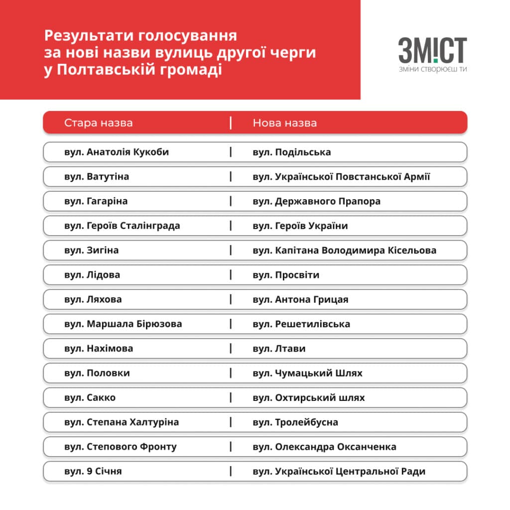 Надалі ці результати має затвердити робоча група з перейменування у Полтавській громаді. Після цього їх затвердять депутати Полтавської міської ради, і лише після цього вулиці вважатимуться перейменованими.