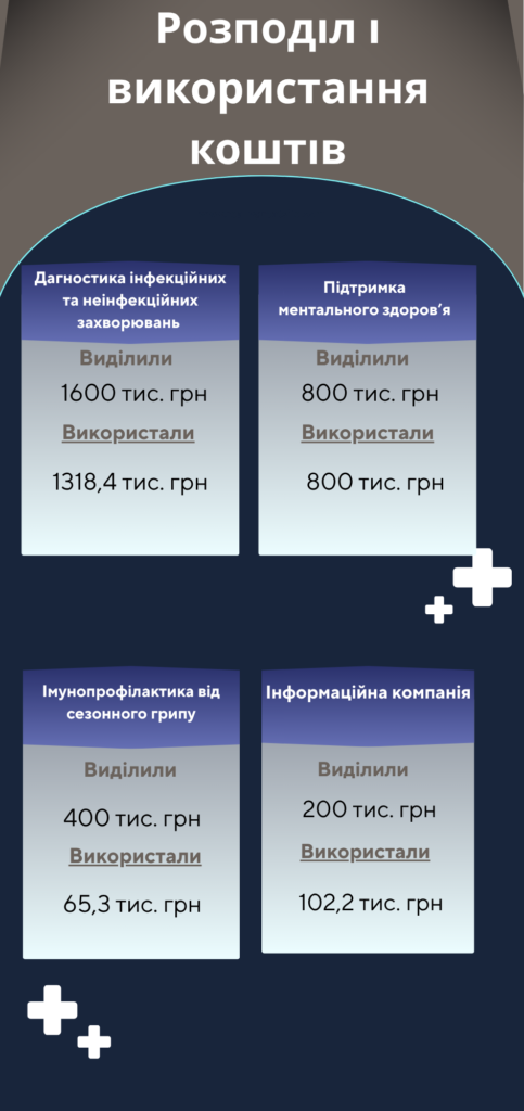 Що стосується коштів на інформування про здоровий спосіб життя та профілактику захворювань, створили дашборди та інформаційні матеріали, також організовували дні боротьби з артеріальною гіпертензією та ожирінням із безкоштовними скринінгами.