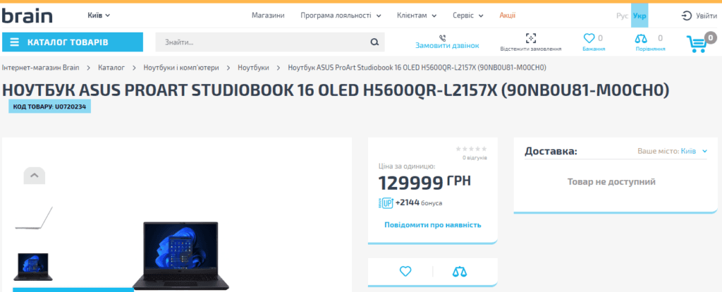 - ноутбук ASUS ProArt Studiobook 16 OLED H5600QR-L2157X в комплекті з мишкою (або еквівалент). Очікувана вартість – 149 тис. грн.