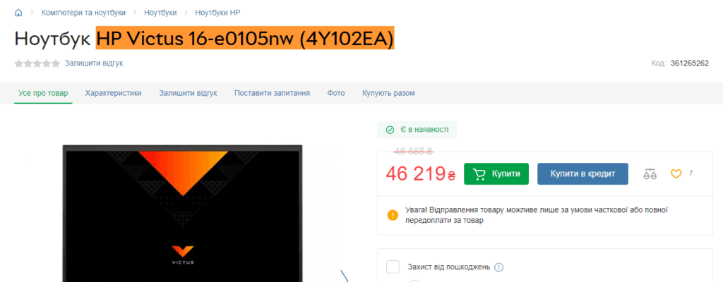 - ноутбук HP VICTUS 16-E0105NW (4Y102EA) ( або еквівалент). Очікувана вартість –61 тис. грн;