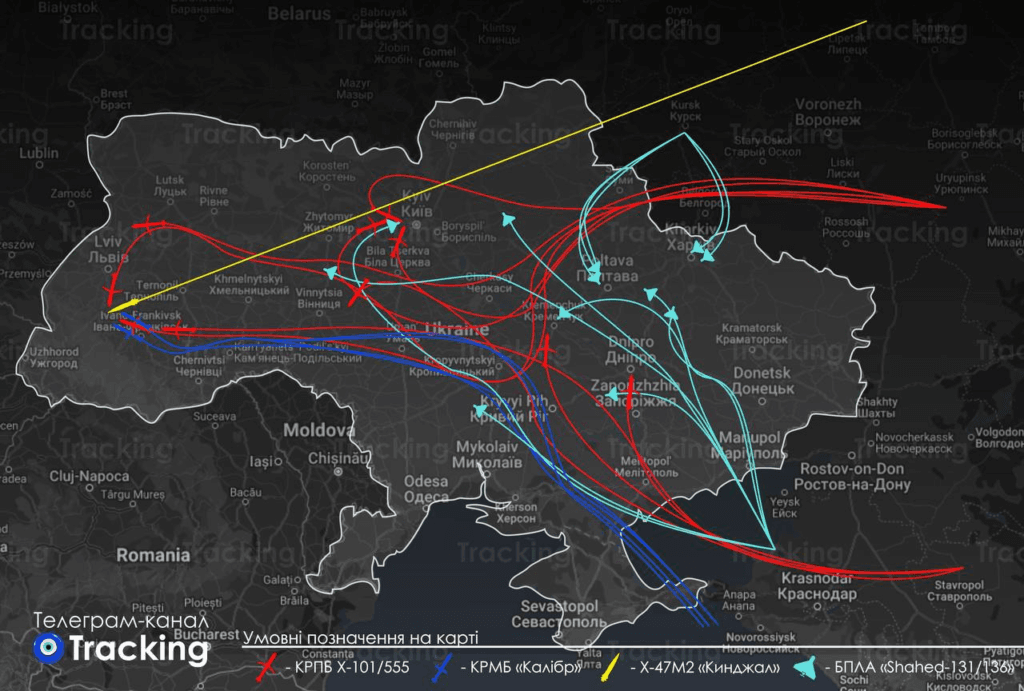 Загалом ворог застосував 76 засобів повітряного нападу – 55 ракет та 21 ударний безпілотник, повідомляють Повітряні Сили ЗСУ. Серед них є «Кинджал», «Іскандери-М», «Калібри» та 45 крилатих ракет. 21 ударний безпілотник «Шахед» запускали з Курської області Росії.