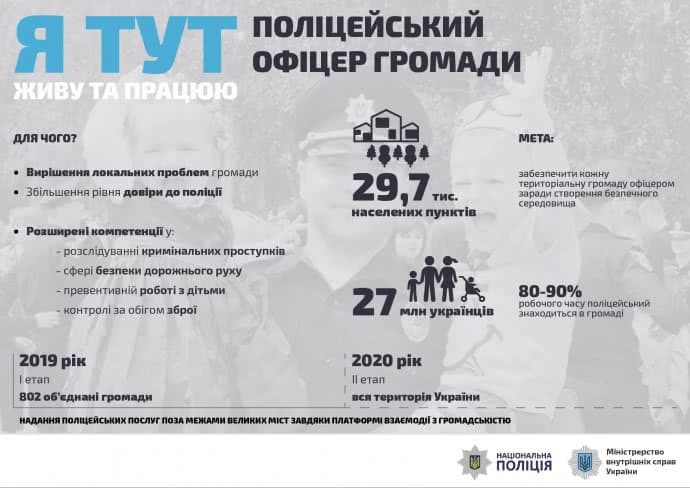 У МВС відзначають, що «Поліцейський офіцер громади» це – та людина, яка знатиме мешканців території, яку обслуговує, їхні проблеми та надаватиме якісні поліцейські послуги. Крім того, він буде доступний для населення і 80-90% робочого часу поліцейський знаходитиметься в громаді.