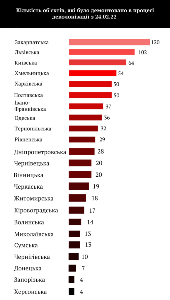 До статистики від проєкту увійшли демонтовані пам'ятники, погруддя та меморіальні дошки, які були розміщені в публічному просторі нашої області за часів радянської окупації. Раніше вони прославляли російських діячів та події того історичного періоду.